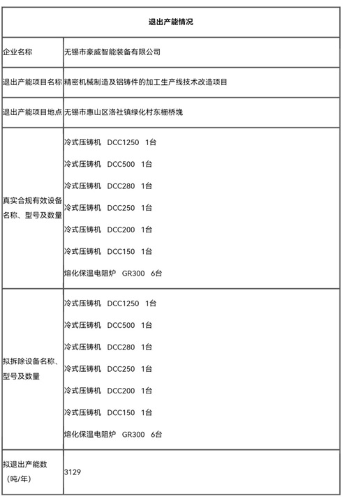 无锡市工业和信息化局于2022年9月30日至2022年10月11日对无锡市豪威智能装备有限公司退出产能进行了公示,公示期间未收到异议。现将无锡市豪威智能装备有限公司退出产能予以公告。