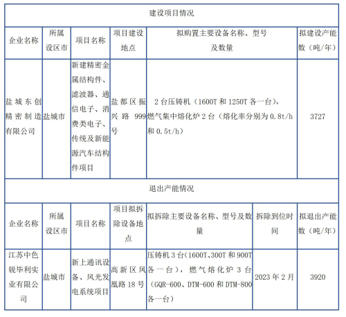 按照《国务院关于印发打赢蓝天保卫战三年行动计划的通知》(国发〔2018〕22号)、《工业和信息化部办公厅 国家发展和改革委员会办公厅 生态环境部办公厅关于重点区域严禁新增铸造产能的通知》(工信厅联装〔2019〕44号)等政策规定, 江苏省工业和信息化厅于2022年10月11日至2022年10月17日对东创精密铸造项目产能置换方案进行公示。