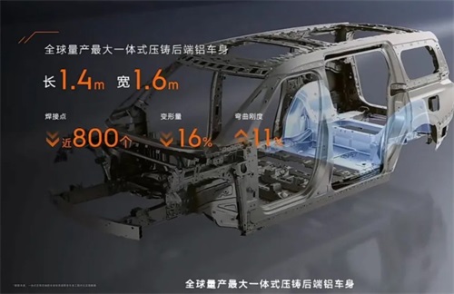 为了实现一体式压铸这一革命性的技术突破,极氪专项投入13亿元,涵盖了从材料革新到生产制造的所有环节。据了解,极氪009车身后地板7200吨级锁模力巨型压铸机为力劲集团设计制造。立石科技为极氪009车身后地板提供了全自动压铸工业机器人系统集成。一体压铸模温控制系统则由苏州奥德高端装备股份有限公司提供。