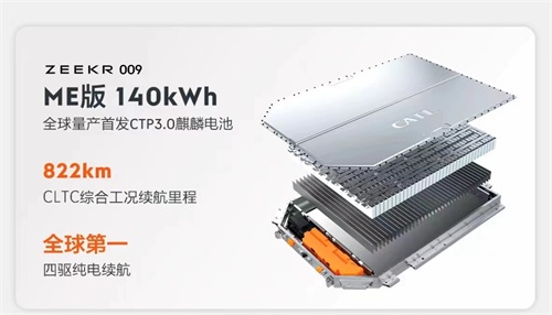 另外,极氪009 搭载了宁德时代提供的116kWh和140kWh 的麒麟电池,采用第三代CTP技术,对应的CLTC续航里程分别为702km 和822km。