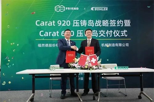 2022年11月17日,福然德股份有限公司旗下子公司安徽优尼科汽车科技有限公司采购的布勒 Carat 610 压铸岛成功交付,同时宣布优尼科二期的扩建规划,续签2套 Carat 920 压铸岛。此外,福然德正在进行第二压铸生产基地重庆工厂的相关产能验证,将继续携手布勒,加速大型一体化压铸的市场布局。