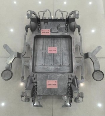 其中,A00缩比下车身使用双压射系统压铸出超大型(2500mm×1300mm)、高集成(130件)和高性能(刚度、强度和NVH等)零件,采用前机舱、后地板、电池壳整体一体压铸工艺。相比传统钢板前机舱、后地板及型材电池壳,一体压铸成形能将145件点焊冲压件数量减少为1件。