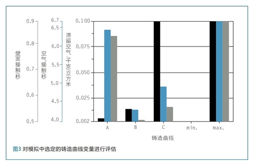 根据模拟结果,选择了三种不同的铸造曲线变体来制造样品材料,以进行进一步研究,其参数也列于表1。图3示出了这三种变量在整个组件上的平均结果,并与所有计算变量的最大和最小标准进行了比较。可以看出,虽然变体A的空气含量相对较低,但它的壁面和空气接触值也较高。在变体B中,所有三个标准都相对较低。相比之下,变体C的空气含量结果最高,空气接触结果适中,壁面接触结果较低。
