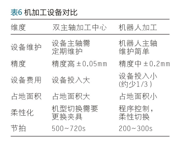 与传统压铸件不同,大型一体压铸件大多孔和面加工精度要求相对较低(孔精度不高于0.1mm,面轮廓度不高于0.5mm)。基于以上情况提出了机器人机加工技术,如图13所示。该技术通过机器人搭配机加主轴来实现产品切削加工,能极大提高加工效率及产线柔性。传统加工中心与机器人加工设备对比如表6。