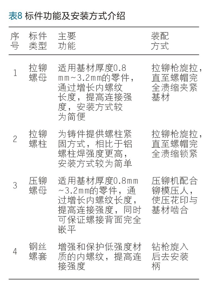 大型一体化压铸件壁厚较薄,部分安装点位无法通过机加螺纹实现。需要通过安装钢制标件来保证安装点位的连接强度。主要标件有拉铆螺母、拉铆螺柱、压铆螺母、钢丝螺套、螺纹套管、螺柱焊等,如表8所示。