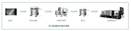 将原材料供应商生产的液态铝以铝包的形式输送至压铸厂,储存于中储炉中,通过除气等操作后直接上线生产。相比于自主熔炼,铝液直供方式省去铝锭重熔环节,节省了能源和场地。适用于铝包供应半径30min内的情况。如图3。