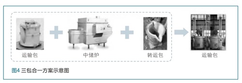 传统铝液直供方案存在保温能耗高,铝氧化烧损大及场地占用大等缺点。为进一步降本,有企业提出将传统的“长途运输包、铝液储存炉(包)、厂内转运包”三种设备的功能整合在一起的铝液直供方式。通过对运输包增加保温装置,使其同时具备储存保温功能和灵活运输功能,从而实现了设备的功能性“合三为一”,取消传统的铝液储存炉及厂内转运包。如图4。