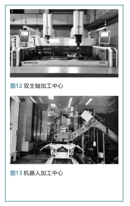 由于压铸毛坯成型精度、模具拔模角度及安装点位需求等,产品部分区域特征需采用数控加工成形。由于大型一体压铸件相对传统压铸件尺寸更大,为提高加工效率,业内通常采用双主轴加工方案,如图12所示。双主轴加工中心可实现一次装夹同步加工产品两个区域,缩短换刀时间,提高加工效率。