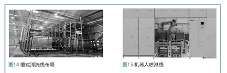 目前业内主要槽式清洗线和机器人喷淋线两种方式。业内使用比较多的槽式清洗线为龙门多臂式超声波清洗线,主要龙门机械臂、超声波系统、加热系统及烘干系统等组成,如图14所示。机器人喷淋线由机器人、超声波清洗、喷淋水清洗、热风干燥、冷却下料等工序组成,如图15所示。