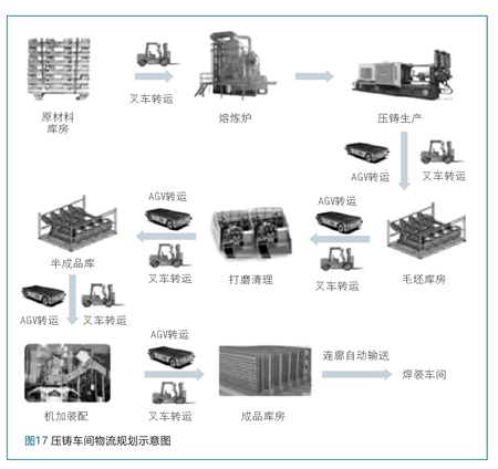 压铸车间物流主要包含原材料、铝合金金属液、压铸模具、铸件的运输。物流运输示意图如图17所示。