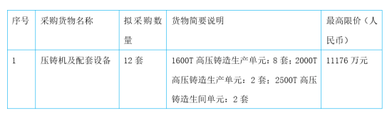 物产中大舜富(安徽)镁业科技有限公司压铸机及配套设备项目采购内容如下: