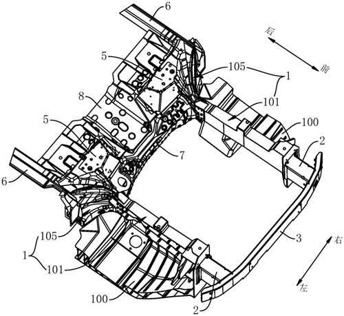 本实用新型可在车身制备时,避免采用超大型压铸设备,以降低车辆的制造成本,同时不同车型之间应用时,也只需调整压铸成型的纵梁前段部分,能够提高不同车型之间的共通化率,而有利于降低车辆的开发及制备成本。
