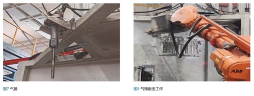 工具配置:英格索兰2130Ti气锤,冲击频率2000bpm,冲击力50-150N,配备长度300mm的加长杆,如图7所示,工作状态如图8所示。