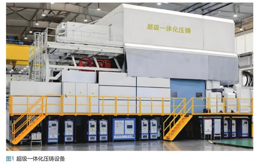一体化压铸成形技术实现了金属液在高压下快速凝固成形,提高了铸件的精度和性能,在汽车零部件领域应用广泛,推动了轻量化、高强度铸件的生产。超级一体化压铸设备如图1所示。近年来,汽车产业尤其是新能源汽车的快速发展对铝合金零部件提出了更高的要求,即体积更大,结构更复杂,性能更好。面对这些需求,伴随着压铸工艺及压铸机制造技术的进步,铝合金一体化压铸工艺应运而生。铝合金一体化压铸工艺是汽车结构件制造中重大变革技术。能通过铸造一次成型,大幅提升了零件整体强度,并且减少装配成本,在生产效率、降本、轻量化等方面优势明显。一体化压铸产品主要包括前舱总成、后地板总成、电池托盘等,具有尺寸大、集成度高及一次成型等特点。