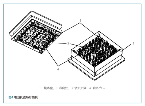 矫形模具如图4所示在上模板和下模板上都设置有多个喷水孔以及气孔,可以在对电池壳压力保持的情况下对其进行喷水冷却,最后再吹干水分,由此保证电池托盘类型产品的变形量。