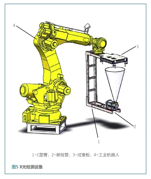 压铸生产过程中,铸件可能因铝液质量不稳定、铸造压力不稳定、抽真空效果不佳、模具温度控制不稳定等因素导致产品内部产生缺陷,如气孔、缩孔、疏松等。而针对一体化产品,主车厂要求X射线检测零件内部品质满足ASTME505Level2以上。在传统的后处理工艺中,一般会把X光检测步骤放置到压铸单元线外去完成,这会产生严重的信息滞后,即在检测出质量问题时压铸已经持续生产了大量不合格件。为此可以通过合理的单元布局将X光检测放置到压铸单元线内,在线上就及时去完成检测,这样发现不合格件后可以及时调整压铸工艺参数。同时也可以利用线内的机器人完成产品的搬运,减少了设备的冗余。由于前机舱后底板等一体化铸件尺寸较大且不规则,因此本研究采用六轴工业机器人带动C型臂去的方式去检测,如图5所示。