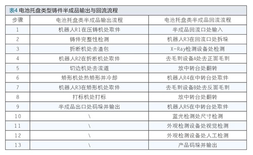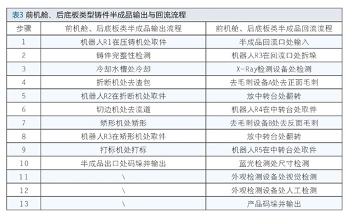 由于压铸单元线内的后处理工艺变得比较复杂,线内单一设备的故障将会影响其后续的工序无法实施,从而影响生产效率。因此就需要单体设备与压铸单元布局相互配合,使某些设备故障时压铸单元仍能够正常生产半成品,与此同时人员可以进入设备内进行维护。待故障修复,压铸机停机维护时,半成品再回流进入压铸单元内进行后处理,生产流程如表3、表4所示。