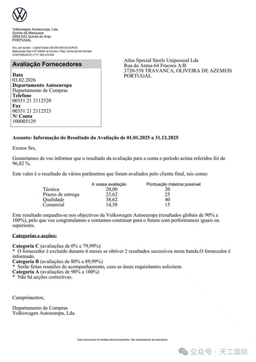 2026年的二月份,从欧洲传来一个激动人心的好消息。天工国际有限公司在欧洲的战略合作伙伴特约经销商Atlas Special Steels Unipessoal Lda(以下简称“Atlas”)收到了大众汽车葡萄牙工厂的评估通知:天工国际供应的模具钢样品,顺利通过大众汽车的考评,助力Atlas公司以96.82%的优异得分获评A级供应商。这标志着天工国际的产品品质与技术实力获得了国际头部车企大众汽车的高度认可,也意味着今后德国大众系的生产企业在采购模具钢材料时,向天工国际敞开了大门。
