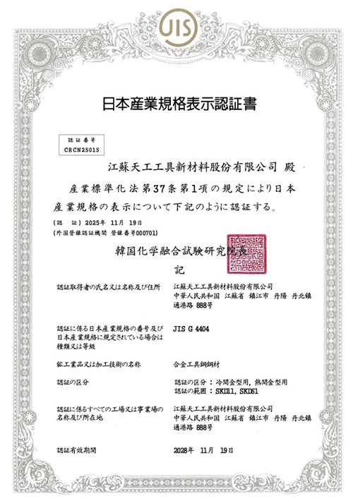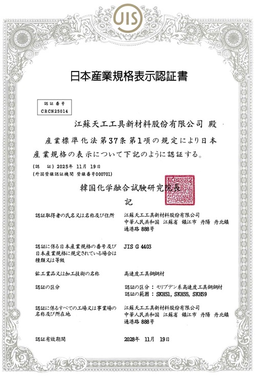 同在2025年,天工国际顺利通过韩国化学融合实验研究院(KTR)的严格审核,正式获得“JIS G 4404合金工具钢”、“JIS G 4403高速工具钢”两项认证。这意味着天工的模具钢产品在化学成分、性能指标、制造工艺及质量管理体系等全流程,已全面对标日本工业标准(JIS)这一国际高端制造领域的顶级标准体系。JIS认证的获得,不仅意味着天工产品取得了通往日本市场的“通行证”,打开了日本的销售市场,更意味着天工国际在全球高端制造供应链中拥有了更强的参与权与话语权,以后可以与国际高端客户展开深度合作。