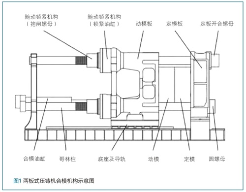 典型的两板式合模机构主要部件有定模板、动模板、哥林柱、底座及导轨、合模油缸、随动锁紧机构等,如图1所示。