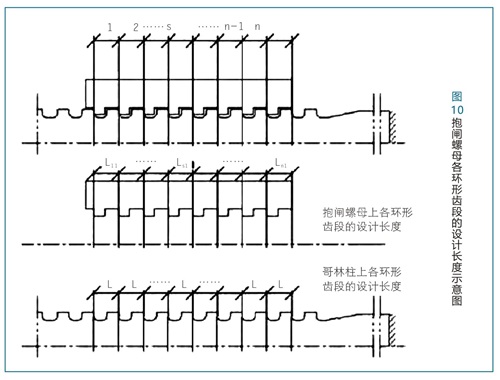 这样既能确保任一环形s段处抱闸螺母和哥林柱的长度差值△s不变,满足轴向载荷均匀分布的变间距要求,又能实现抱闸螺母和哥林柱任意环形牙位置锁紧。