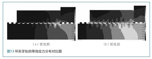 哥林柱环形牙上最大等效应力值从513.7MPa降至256.2MPa,降幅达50.1%,如图14所示。