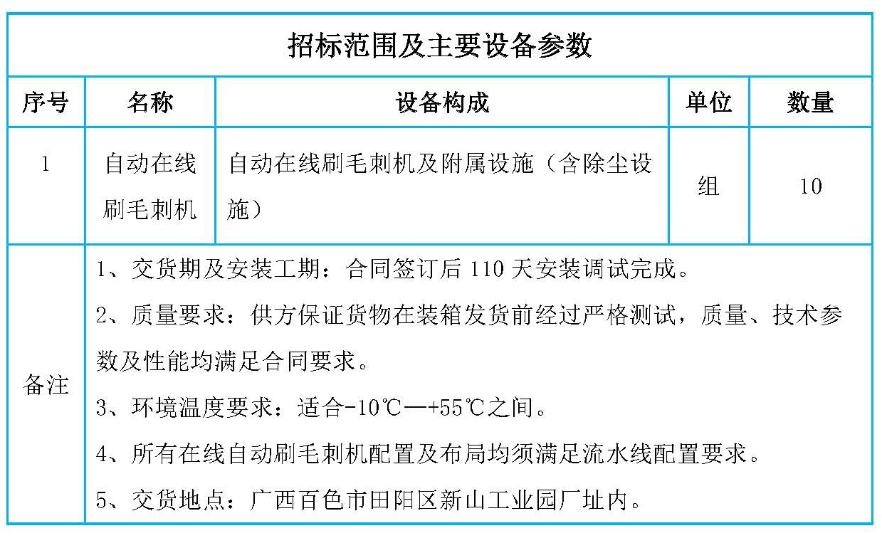 广西百矿新材料技术有限公司位于广西百色市田阳区新山工业园,规划筹建年产量1000万只铝合金轻量化轮毂项目,分两期建设,一期和二期生产规模各520万只。一期机加粗加工自动在线刷毛刺设备由刷毛刺机及除尘机构成,用于机加工后,将轮毂表面及轮幅尖角通过上下毛刷的配合转动磨出圆角满足产品生产工艺所需,现广西百矿新材料技术有限公司就2020年铝合金轮毂项目(一期)自动在线刷毛刺机设备采购及安装项目进行招标。