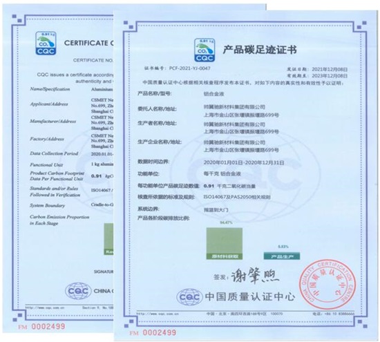 近日,帅翼驰新材料集团有限公司(以下简称“帅翼驰”)委托中国质量认证中心,对其核心产品——铝合金液,进行碳足迹核算及评估,并顺利获得碳足迹认证。帅翼驰单吨铝合金液碳排仅0.91吨CO2,其中源于产品生产阶段的碳排占比仅5.53%。该认证依照ISO14040,ISO14067标准以及PAS 2050国际碳足迹标准进行。
