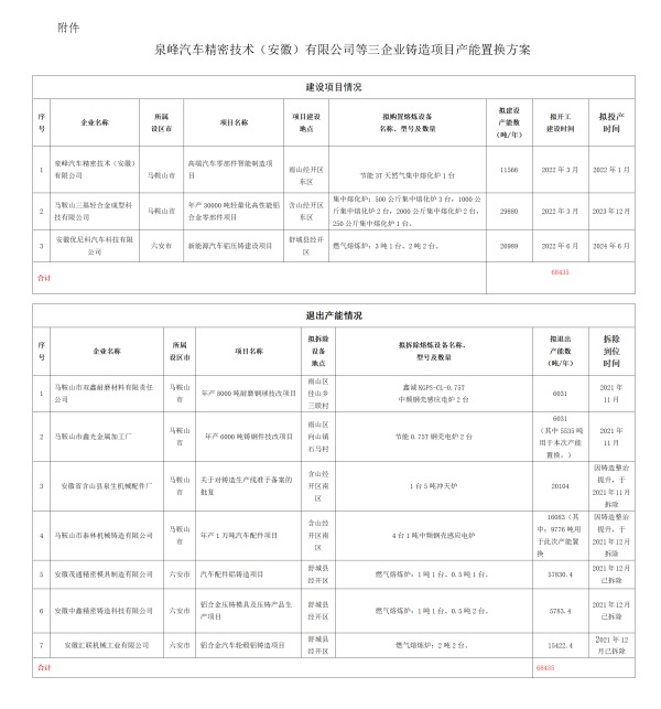 按照《工业和信息化部办公厅国家发展和改革委员会办公厅生态环境部办公厅关于重点区域严禁新增铸造产能的通知》(工信厅联装〔2019〕44号)、《安徽省铸造产能置换管理实施办法(暂行)》要求,现将泉峰汽车精密技术(安徽)有限公司三家企业铸造项目产能置换方案予以公示。