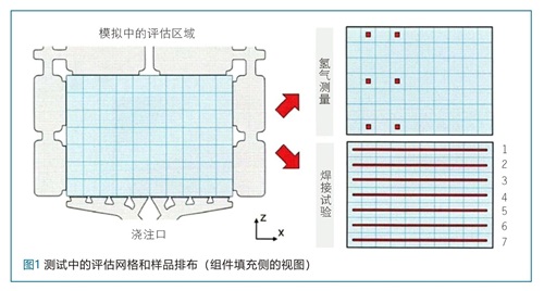 接着,将模拟得出的评估网格(见图1)投射到板材上,并确定无泡和起泡评估区域。在评估中,无泡区域编号为“0”,起泡区域编号为“1”。通过计算各个铸件系列板材的平均值,确定了作为焊缝位置和浇铸曲线变化函数的数据的起泡评估区域的平均频率。