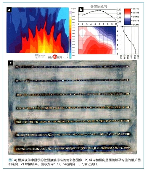 如图2所示,以壁面接触为例,Magmasoft可为每个标准输出伪彩色图像。不过,这些伪彩色图像仅代表最外层可见网格层的结果。因此,在组件上放置了一个由7×10个评估区域组成的网格,每个区域的边长约为20厘米×20厘米×3厘米,用于评估模拟中的铸造曲线变体(见图1)。然后对评估区域内的分析标准进行平均处理。如图2所示,可通过对整个组件在高度和宽度方向上的平均值来分析所考虑标准的位置依赖性。图2还示出了相同铸造曲线变量的板材焊接结果。