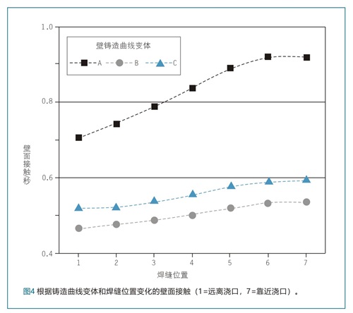 如图4所示,在对所有铸造曲线变体进行评估时,发现壁面接触标准与焊缝位置有关,在浇口附近的壁面接触持续时间值会增加。铸造曲线变体A的值最高,变体B的值最低。其原因在于第1阶段的最终速度参数,该参数对铸模填充的总持续时间以及熔体与型腔壁的接触持续时间有很大影响。