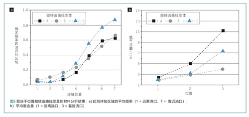 图5a示出了起泡评估区域的平均频率与焊缝位置和铸造曲线变量的函数关系。从图中可以看出,在所有的铸造曲线变体中,起泡都与焊缝位置有关,而且随着焊缝距离浇口越来越近,起泡的频率也会显著增加。此外,可以确定的是,在浇口附近,采用C型铸造曲线铸造的部件中起泡的区域增加了约三分之一。