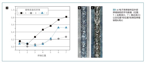 在目视检查中,外部焊缝缺陷,即喷射坑和可见的表面气孔,根据其在评估网格中的位置被记录下来。在评估中(图6),还确定了与浇口距离之间的相关性。与氢气测量结果一样,外缝缺陷的数量在浇口附近增加。此外,这里还发现了与氢气测量相同的铸造曲线变体分级,其中变体A的外部焊缝缺陷数量最多,而变体B的数量最少。