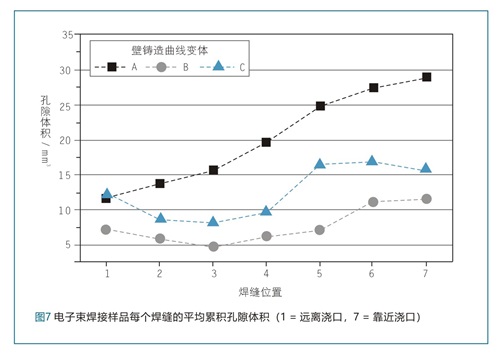 进行孔隙率分析后,接着将数据集中检测到的每个孔隙分配到评估网格中的一个区域,并将每个区域中各个孔隙的体积相加。如图7所示,在这种情况下还可以确定焊缝位置与浇口距离的相关性。所有浇铸曲线的孔隙率都沿着浇口方向增加。但与变体A不同的是,变体B和C的孔隙率最小值不是在距浇口最大距离处,而是在靠近板材中心的位置3处。铸造曲线变体的分级也类似于氢含量和外焊缝缺陷的调查,因此变体A样品的孔隙率最高。