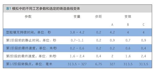在数值研究中,首先确定了压铸样品的制造参数。这样做的目的是获得代表不同焊接性能等级的不同材料质量,以便进行进一步研究。使用Magmasoft5.4.1软件进行了铸造过程模拟。假定模具填充、空气湍流、液态熔体与模具壁的接触特性以及脱模剂沉积是影响压铸部件局部焊性能的最重要因素。在模拟过程中,通过改变五个参数来描述腔室和模具填充过程(表1)。在这些参数中每个参数都在三个支撑点上变化,因此在全因子模拟中计算出了243种不同的变量。在模拟过程中,仅计算了腔室和模具填充工艺步骤,而忽略了凝固工艺阶段。