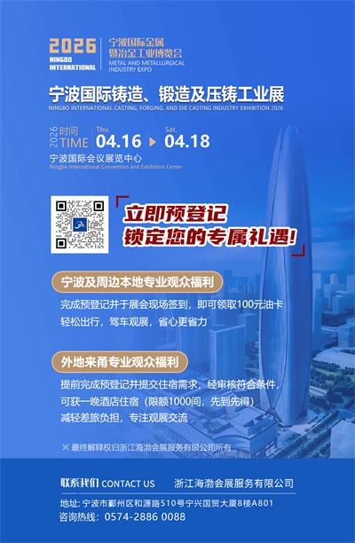 2026 年 4 月 16-18 日,宁波国际铸造锻造及压铸工业展览会将在宁波国际会展中心重磅登场,本届展会以 “精准对接、技术赋能” 为导向,打造集技术展示、供需对接、产业交流于一体的行业标杆平台,为全球铸锻产业高质量发展注入宁波动能。