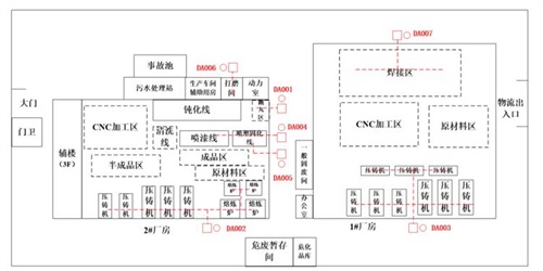 1#厂房共1层,位于厂区东北侧,占地面积11500平方米,高度为19.2米,共1层,位于厂区东北侧,布置CNC加工区、焊接区、压铸区。2#厂房共1层,占地面积11063.52平方米,高度为19.2米,共1层,位于厂区东北侧,布置喷漆线、喷塑线、钝化线、CNC加工区、抛丸机、熔炼炉、压铸机等生产区域。办公楼位于2#厂房西侧,用于办公,共3层,建筑面积2500平方米。