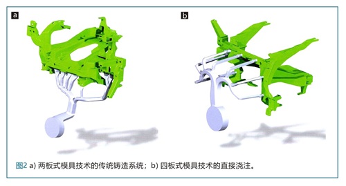 相比之下,将浇口移向结构件中心可减少直接压铸中的流动长度,从而提高合金在较薄壁结构件中的充填性性(图2b)。使用第三块浇板可以消除由此产生的咬边。但是,在这种情况下,当打开模具时,结构件区域的浇口会不规则地撕裂,从而导致后续工序产生额外支出。