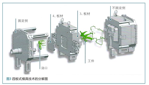 创新型四板式模具专利技术为这一问题提供了解决方案。在浇口区域增设的第四块板可使结构件在加工过程中以受控方式从浇口中脱出(图 3)。这块板在可移动的第三块板内被引导,并可通过横向滑轨平移。该技术的另一个优点是减少了压射面积,因为浇口系统的一部分位于结构件投影面积中。因此,该技术可用于现有压铸设备单元。