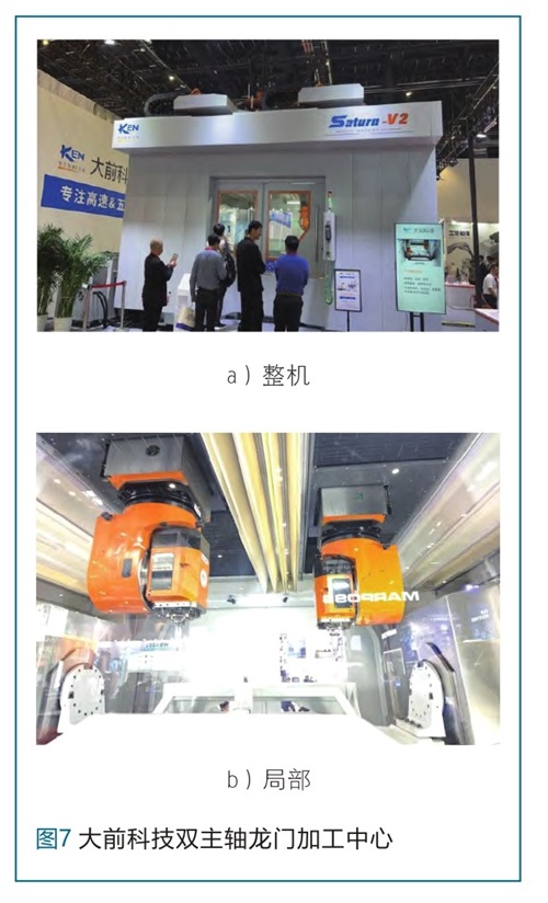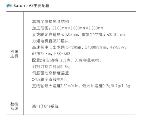 (3)大前科技-Saturn-V2 大前科技一直专注于汽车模具产业、航空航天产业、精密加工产业,其高速五轴龙门加工中心(见图7)一直是模具市场比较畅销的产品。大前科技推出的Saturn-V2主要配置(见表6)也继承了大前科技高速龙门的高动态性能的优势,直线轴最高速度可达120m/min,最大加速度可达13m/s2,配置自制高速偏置B/C双摆头、A轴翻转台,能够实现零件一次装夹六面加工,完成全部加工要素。