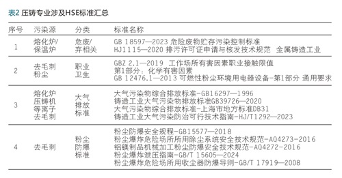 压铸岛及周边环境保护方面的要求,如表2压铸专业涉及标准汇总所示,其中包含危废/弃物相关、职业卫生、通用标准、大气排放标准、大气污染防治技术和粉尘防爆标准等多个方面。