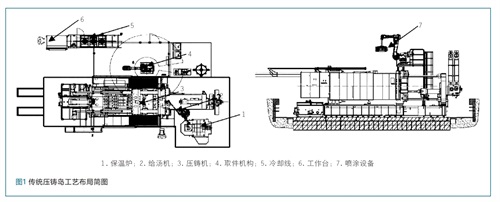 铝合金压铸在汽车行业及通讯行业得到了广泛的应用,特别是2020年以来,以特斯拉为首一体化压铸的兴起,引领压铸行业进入6000t以上超大型压铸时代。通常压铸机、保温炉、喷涂系统、取件设备和冷却设备等构成了压铸单元,行业术语称之为压铸岛。这些设备协同工作,实现铝合金等轻金属快速成形,通过冷却后得到所需的铸件。一体化压铸兴起以前,2000t压铸岛周边自动化配备简单,如图1传统压铸岛工艺布局,自动化仅仅用于喷涂及取件,渣包和料饼去除全部采用手工去除。