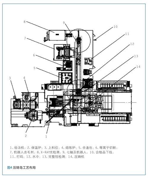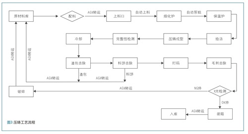 图3为设计的工艺流程图,为了减少搬运过程,所有的加工都在压铸岛内完成,铝锭的投料采用移动机器人小车(以下简称AGV)以降低劳动强度。