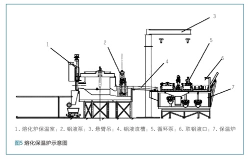大型一体化压铸带浇注系统质量约为82kg,按90s节拍计算,每小时铝液消耗量为3.28t,为了保证产能的稳定性,选择4t/h熔化能力的熔化炉。为了保证保温炉温度的稳定性,选择10t保温炉。如图5所示,铝液熔化后,通过铝液泵将铝液运输到保温炉中,保温炉下方也通过透气砖通入氩气,让铝液中的氢气溢出,同时保温炉也设计循环泵,保证铝液的密度指数小于2%。同时也避免了传统保温炉通过叉车转运铝液,大大降低了劳动强度,提升了效率。