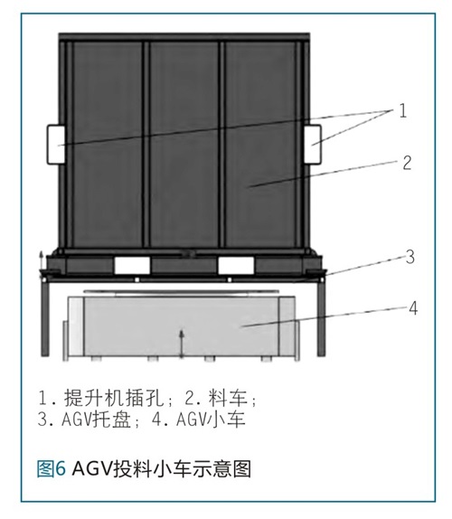 图6所示,熔化炉上料采用AGV的方式,主要构成有AGV小车,托盘和料车,料车底部带有叉车孔,方便叉车上下料,侧面的叉车孔和熔化炉投料提升机链接,可以提升料车,实现无人化操作。