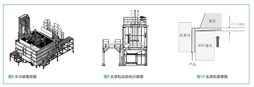 由于产品质量较大,采用传统的风冷方式,需要更多的时间且占用空间大,因此,大型一体压铸零件冷却必须采用水冷,这样效率更高。可以在30s以内将产品的温度降低在70℃以下,为后工序的产品尺寸稳定性提供了保障。水箱的材质采用304不锈钢,可以避免后续使用时生锈。水温控制在50℃左右。如图8所示,水冷工装采用浮球加紧工装,借助水的浮力,在升降过程中,零件定位更稳定,速度更快,生产效率更高。