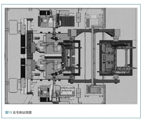 大型一体压铸零件,可采用机器人配合电主轴方式进行毛刺处理,工具可以选用锉刀、铣刀和砂轮片等工具,对零件毛刺和非标进行打磨处理。毛刺主要产生的位置为产品分型线、镶拼线和顶针痕迹。为了让去毛刺站高效运行,采用双各位旋转工作台结构,保证上下料不影响去毛刺加工时间;同时,产品夹紧工装具备360°旋转,既保证了产品的正面可以去毛刺,反面也可以去毛刺。去毛刺的标准主要参考整车的装配,分为不同等级,影响装配和外观的毛刺必须去除,对不影响外观及功能的毛刺,可以不用去除。如图13所示。