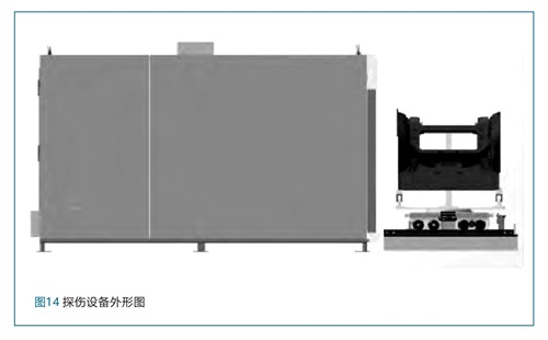 同时由于信息传递延迟,浪费时间。为了解决这些问题,将X-RAY探伤设备集成在压铸岛中,不仅减少了产品的搬运,还可以快速反映铸件品质的状态。同时也可以根据增加抽检的频率。减少不良损失。图14为X-RAY探伤设备的外形图。产品放在检测支架小车上,下方有四个滚轮,由于小车下面的轨道和探伤房内部的轨道不连续,四个滚轮完美解决这个问题。小车进入铅房内,关闭安全门,开始进行探伤检测。
