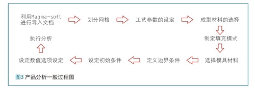 在Creo中创建AlSi10Mg(Fe)电控箱体三维模型后,通过导入Magma-soft,对产品进行数值模拟分析,图3为使用Magma-soft对产品分析一般过程图。从图中可知工程师需要对铸造工程参数及铸造质量的影响因素有透彻的了解,才能达到使用Magma-soft以最低的成本生产高质量的铸件效果。